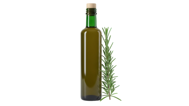 Olive oil bottle with rosemary isolated PNG, extra virgin oil in glass bottle with wooden cap on transparent background