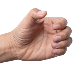 man hand holding something like a bottle on white background.
