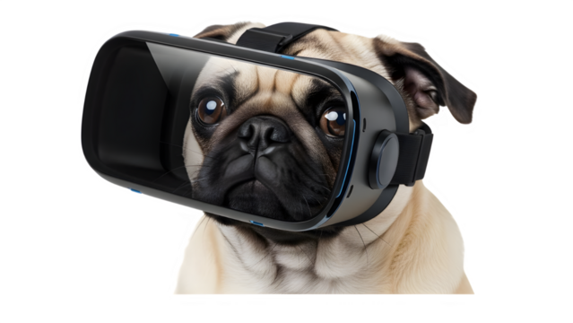 Pug Dog Wearing Black Virtual Reality Headset on White Background