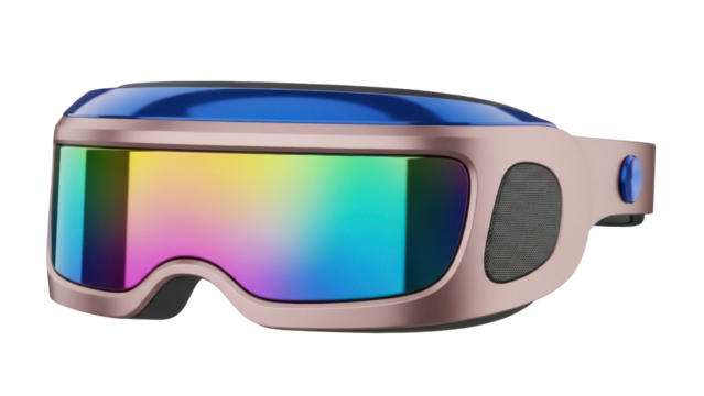 Futuristic augmented reality smart glasses with colorful gradient lens isolated on transparent background, representing innovation and technology.