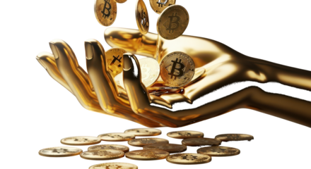 Golden Hand Reaching Out With Falling Bitcoin Coins Cryptocurrency Concept money isolated on a transparent background