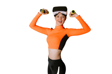 Smiling woman enjoying virtual reality experience with transparent background