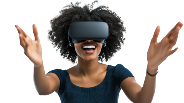 Woman engaging with virtual reality, enthusiastic expressions, transparent background