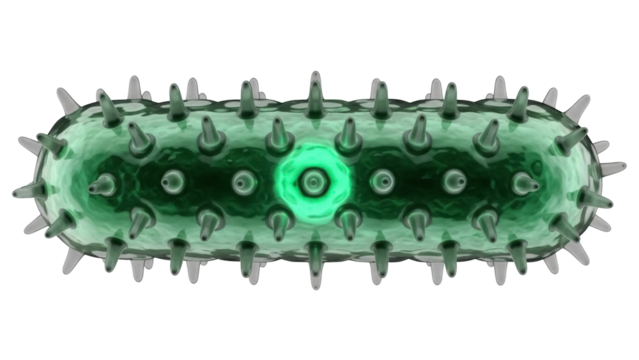 Green bacteria cell PNG isolated on transparent background, microbiology pathogen with spikes for science and medical use