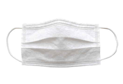 A white disposable face mask,  flatlay,  with  elastic ear loops