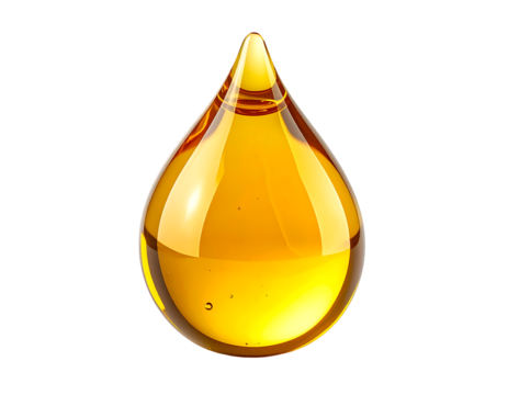 A single, glistening amber droplet, exhibiting high viscosity and transparency, suspended against a stark black background
