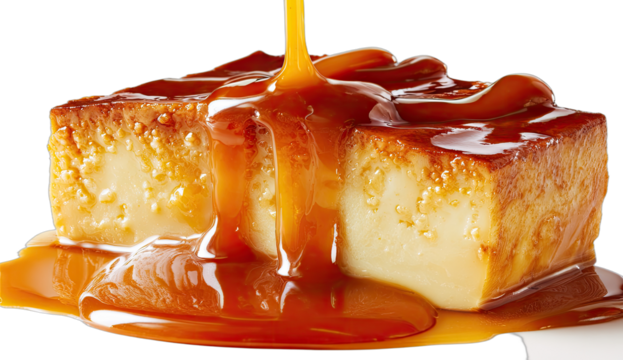 Creamy dessert with rich, viscous caramel sauce cascading over the top