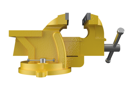 Yellow multipurpose bench vise, with an open jaw position. Tool is isolated on a PNG Transparent HD Background. High resolution image.