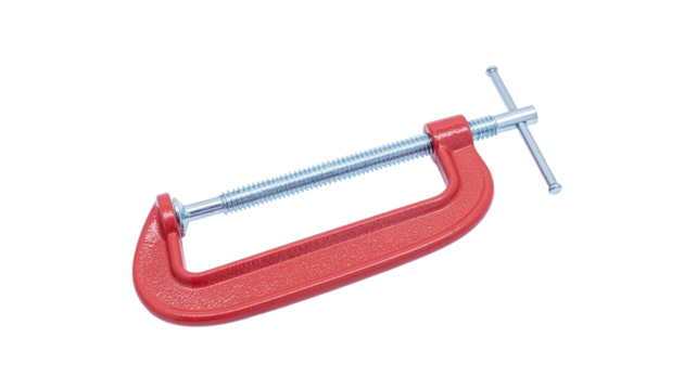 Red c clamp with a silver screw mechanism and a t shaped handle, angled view of the tool on a plain surface white background cutout