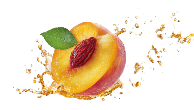 A juicy peach cut open with visible seed and a splash of golden-hued liquid, isolated