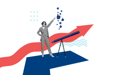 Woman in business suit looking through telescope inside cutout yellow lightbulb on clean white background, concept of vision, ideas and innovation