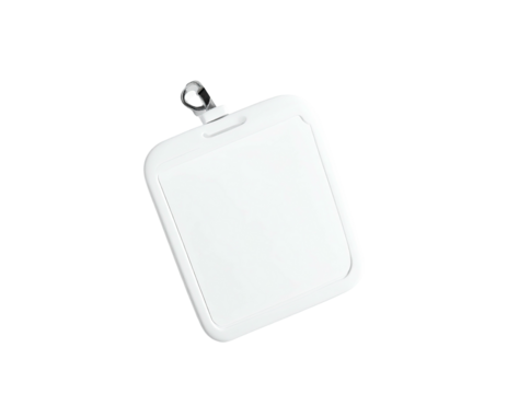 Blank white identification badge dangling from neck cord, transparent backdrop highlighting mockup design potential