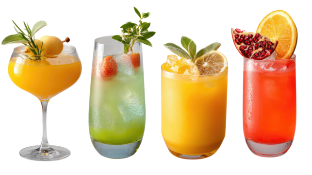 Juicy Bottles Arrayed: An inviting array of colorful juices, presented in glass bottles, offer a refreshing visual feast, suggesting a medley of vibrant, healthful, and invigorating flavors.