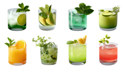 Refreshing Assortment of Cocktails: A vibrant overhead shot showcases an array of meticulously crafted cocktails. Each glass bursts with refreshing colors. A visual delight that will make you crave.