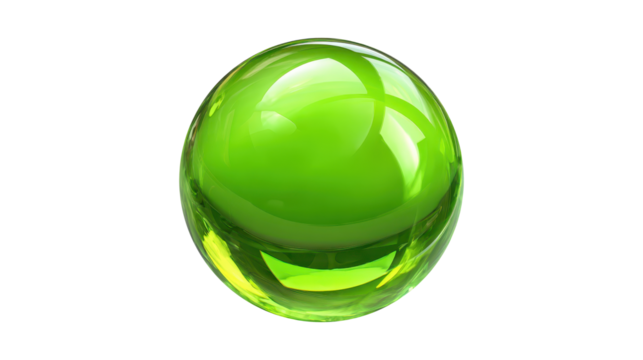 Green glossy transparent sphere, a liquid glass geometric object reflecting light, creating a modern visual for various concepts while presented on a clear alpha channel background, png