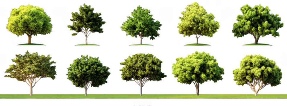 Set of realistic tree images showcasing various angles and styles, highlighting beauty and diversity of nature. Each tree displays unique foliage and structure, evoking sense of tranquility