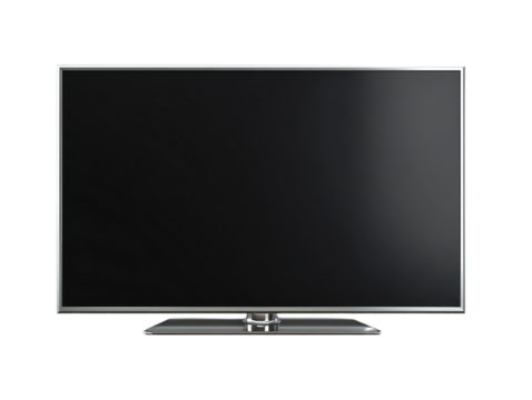 Flat screen LED television with black display and silver stand, modern electronic home entertainment device isolated on white background