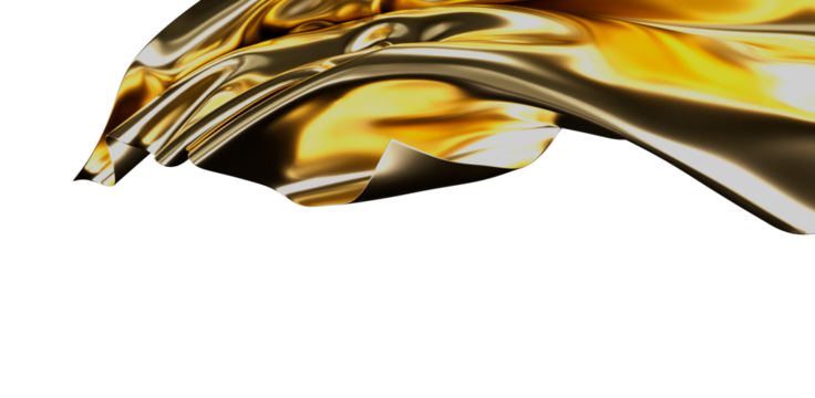 Abstract illustration of a golden liquid wave with bright highlights and reflective texture on a white background. Ideal for luxury concepts.