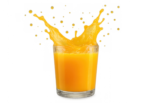 Orange juice splashing from a glass. Refreshing liquid bursting with vitality on an isolated background