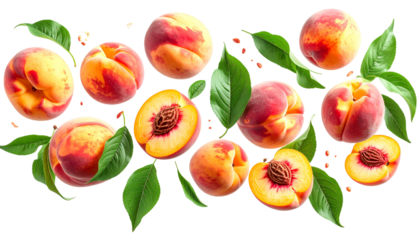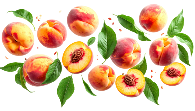 Ripe apricot halves and whole fruit, with leaves