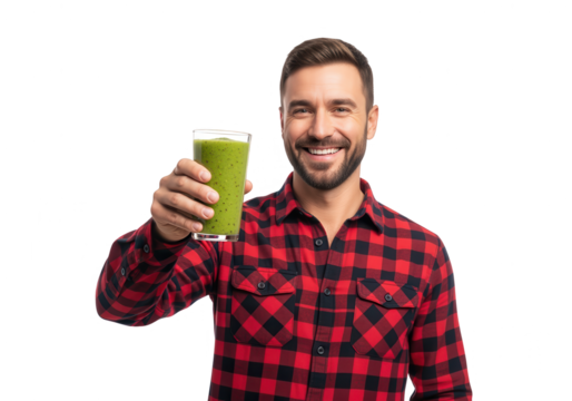 Happy Man Holding Up a Green Smoothie Isolated on White