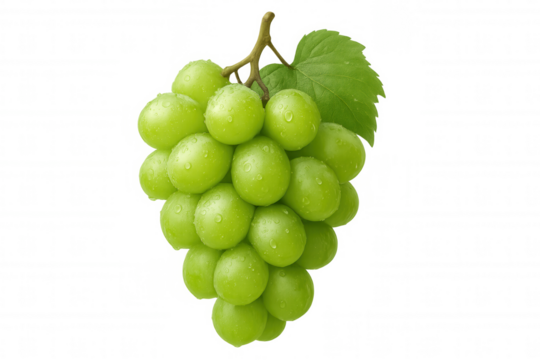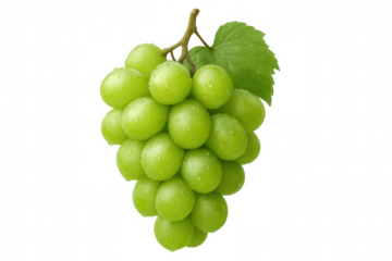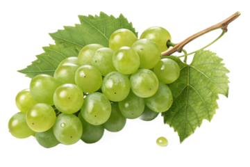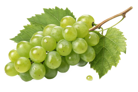 Fresh green grapes on a vine with leaves. Organic fruit representing healthy eating, harvest, and winemaking. Transparent background