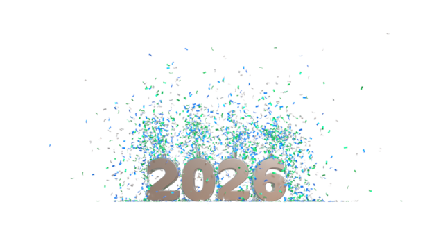 texte 2026 argenté avec deux jets de confettis vert et bleu - illustration 3D pour le nouvel an sur fond transparent