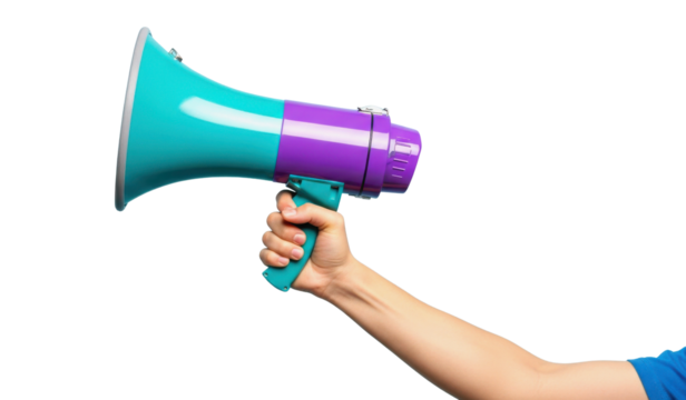 Hand holding vibrant teal and purple megaphone on white background
