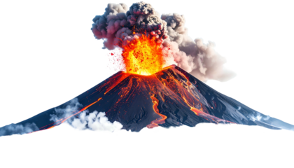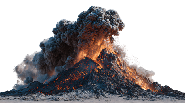 Explosive volcanic eruption with massive ash cloud and glowing molten lava, isolated on a transparent background