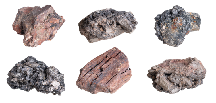 Dark volcanic soil texture with brown pigment on black background, cut out transparent