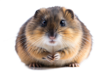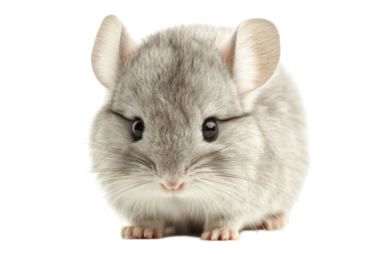 Studio shot of a fluffy gray rodent with large eyes and ears against a transparent background. The animal is centered with soft lighting and a focus on its fur texture