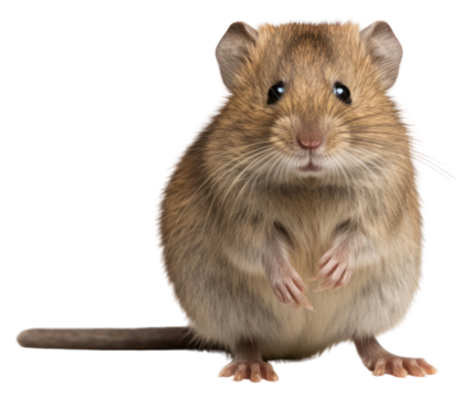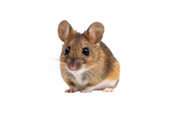 Cute brown striped field mouse with prominent ears and whiskers, facing forward in alert position, isolated on a transparent background