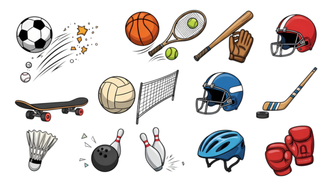 A vibrant collection of diverse sports gear and equipment illustration on black background isolated on transparent background