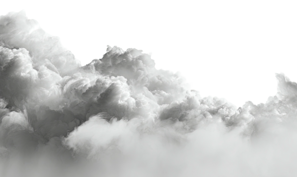 A large, cumulus cloud isolated on transparent background, featuring a dense, cottonlike texture with varying shades of white and gray, creating a dynamic and voluminous form against the clear backdro