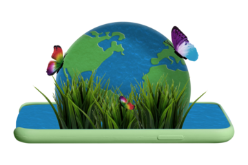 Creative abstract 3d artwork collage photo of butterflies on green clear planet earth in smartphone case isolated painted background