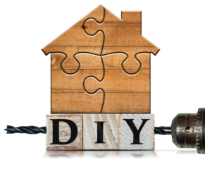 Close-up of DIY text (do it yourself), made of wooden blocks and a wooden house made of puzzle pieces and an electric drill with black tip, isolated on white or transparent background. Png.