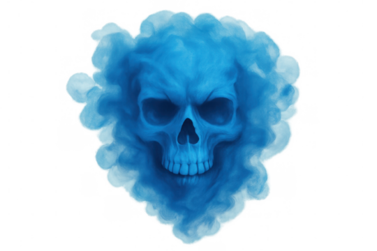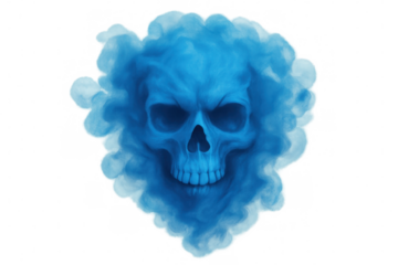 Blue smoky skull emerging from ethereal mist, symbolizing death, fear, and danger. Transparent background