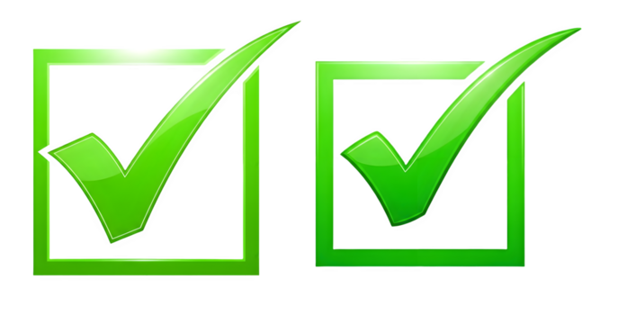3d illustration of two glossy green check marks inside square boxes, symbolizing approval, completion, and success, isolated on transparent background