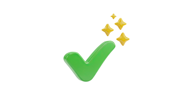 3D Green Check Mark and Sparkles Icon on transparent background