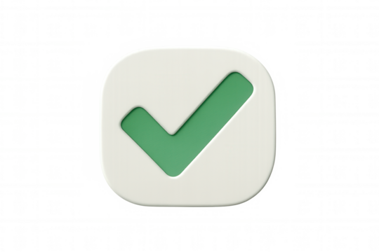 Green check mark symbol inside rounded white square, signifying confirmation, approval, success on transparent background, 3d rendered graphic element