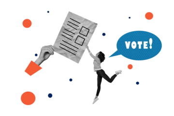 Composite photo collage of astonished girl jump hands hold paper sheet ballot election bulletin bubble vote isolated on painted background