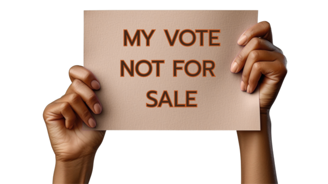 A pair of hands holds a sign that reads, "MY VOTE NOT FOR SALE," emphasizing the importance of voting integrity and civic responsibility.