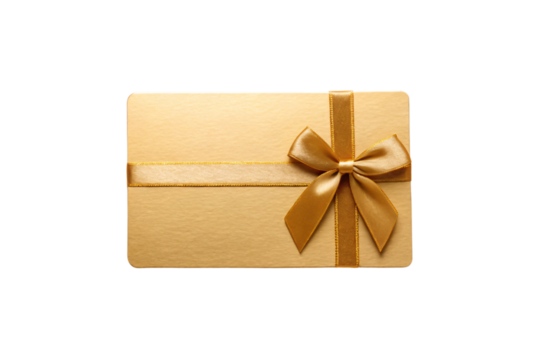 Golden gift card or voucher with elegant satin bow, premium present certificate design, isolated on a transparent background