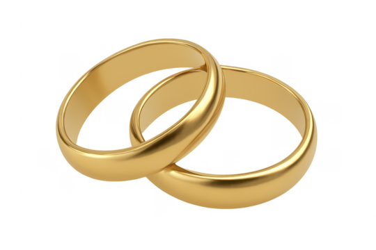 Two interlocking golden wedding rings on transparent background