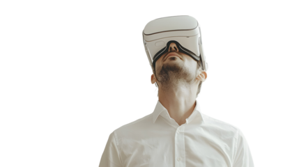 Smiling man experiencing virtual reality with headset and joystick on transparent background
