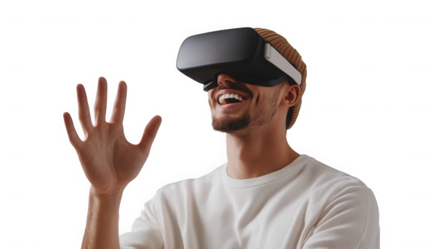 A man wearing a vr headset with his hand raised and a happy expression on a black isolated background on transparent background