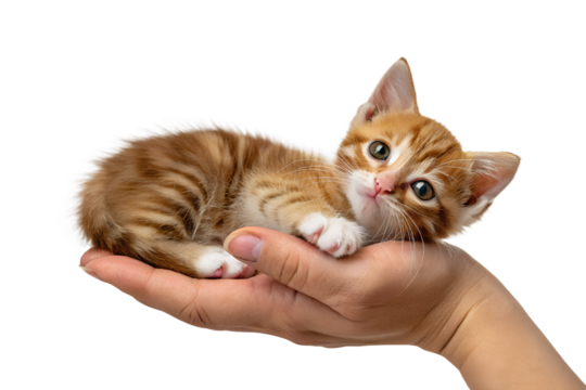 Small ginger kitten lying peacefully in a person's cupped hands, symbolizing vulnerability and protection