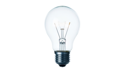A close-up shot of a transparent incandescent light bulb. It has a metallic base and internal filament visible, isolated on a black background