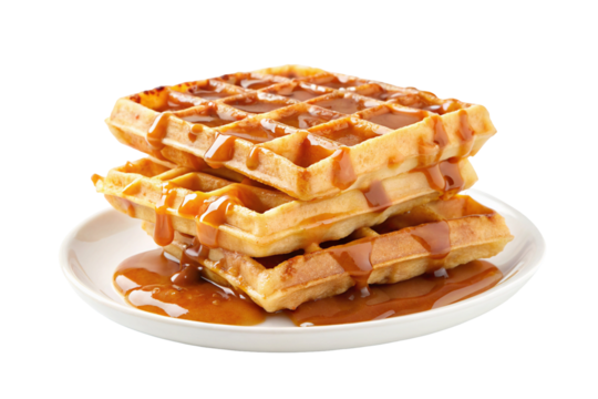 A stack of three waffles on a white plate covered in caramel sauce ready to be eaten for breakfast on transparent background