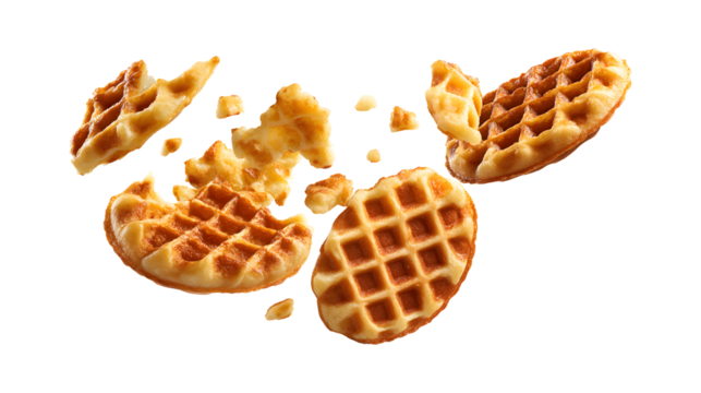 Belgian waffles and waffle pieces levitating in the air isolated on a white background